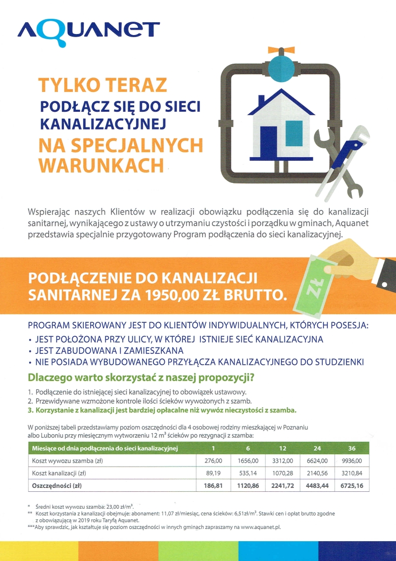 Tylko teraz podłącz się do sieci kanalizacyjnej na specjalnych warunkach. Program skierowany do klientów indywidualnych – więcej ulotka Jak podłączyć się do sieci: link