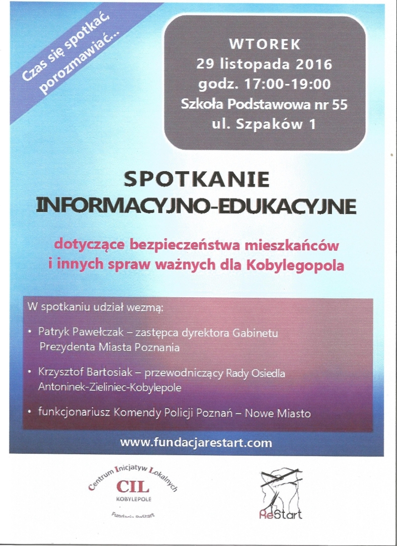 Uwaga Mieszkańcy Kobylepola! W ramach Centrum Inicjatyw Lokalnych, prowadzonego przez Fundację ReStart, zapraszamy do dyskusji! Projekt jest współfinansowany ze środków Miasta Poznania